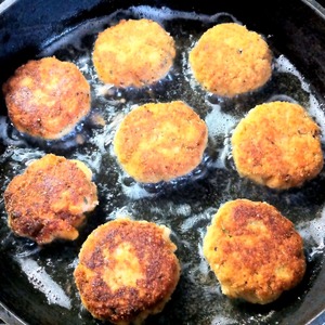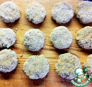 Сформовать шарики размером с мячик для пинг-понга. Обвалять в панировочных сухарях и сформовать котлетки.