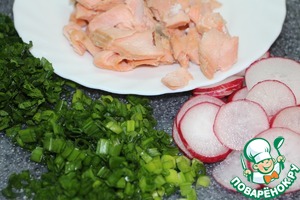 Отварную горбушу разобрать на мелкие кусочки, удалив кожу и попадающие косточки. Листья салата промыть, высушить, порвать руками. Редис нарезать тонкими колечками. Зеленый лук и петрушку мелко порубить.
