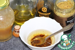 Для заправки смешать мед, оливковое масло, зерновую горчицу, соевый соус, взбить вилочкой до получения однородной массы.