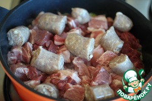 • Положить мясо, сверху колбаски. Аккуратно перемешивать, чтоб все хорошо обжарилось.