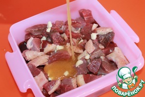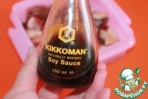 Складываем утку в контейнер. Добавляем соевый соус Kikkoman. Он заменяет нам в этом блюде полностью соль.