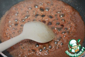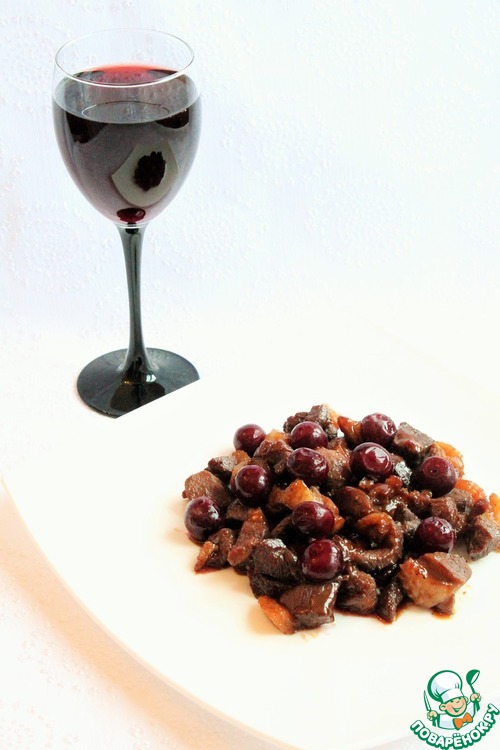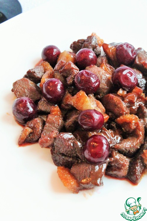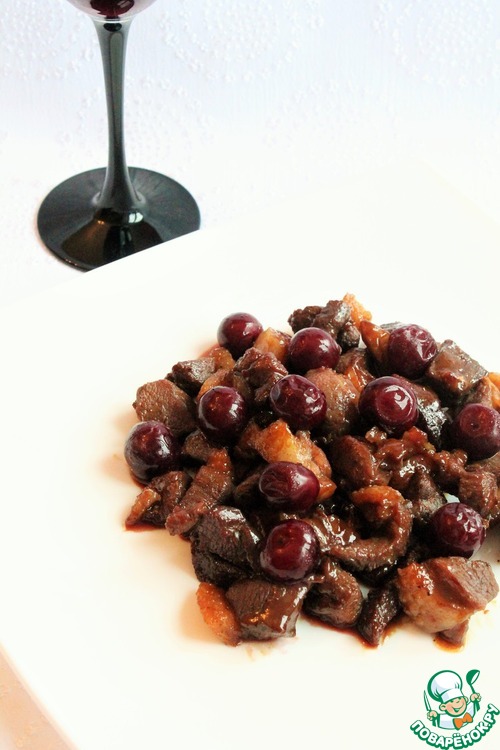 На сковороду наливаем остатки маринада и на сильном огне увариваем до густоты. Мясо поливаем соусом. Подаем с красными ягодами малиной, вишней или черешней. И обязательно с красным вином.
