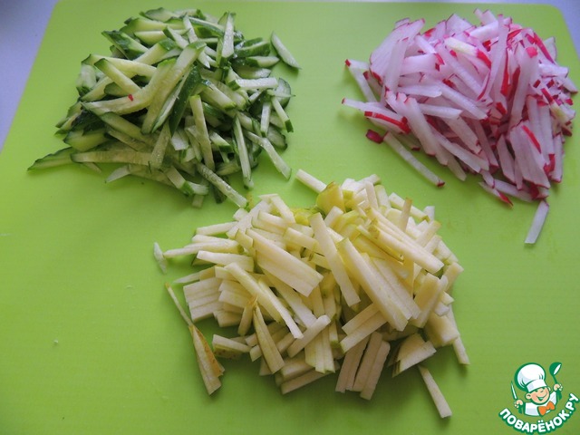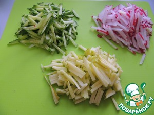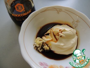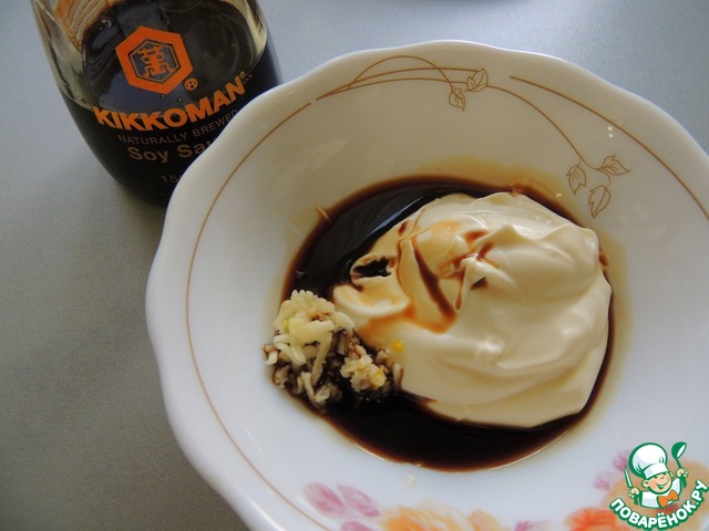 Для заправки очистить и натереть на мелкую тёрку чеснок, добавить майонез и соевый соус Kikkoman, перемешать.