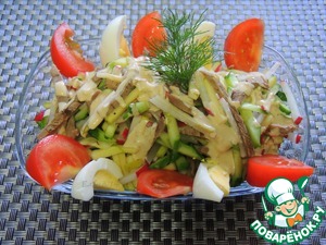 Яйца отварить нарезать дольками. Помидоры тоже дольками. Заправить салат, по краю выложить дольки помидоры и яиц. вкусный и полезный ужин готов. Приятного аппетита!