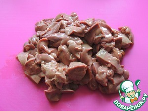 Печень моем и режем на средние кусочки.