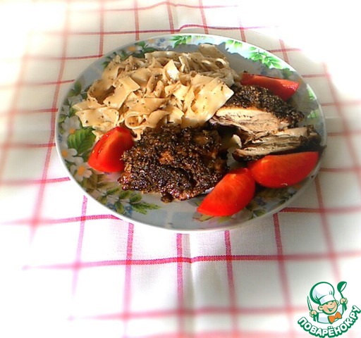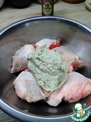 Куриные запчасти вымыть, обсушить бумажным полотенцем, подсолить по вкусу и добавить ореховый соус. Соуса получилось много, у меня ушло половину в курицу, другую половину съел муж, намазав на хлеб.