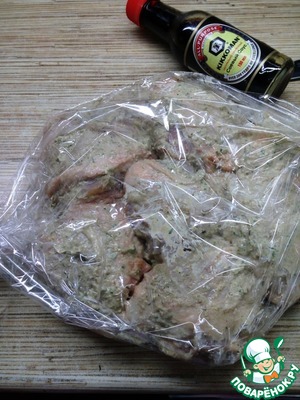 Хорошенько перемешать курицу в соусе, оставить на 5 минут подумать, а пока займемся подготовкой к выпечке. Отрезать необходимое количество рукава для запекания, завязать с одного конца. Выложить куриные бедра рядком, завязать с другого конца и проколоть рукав в паре мест.