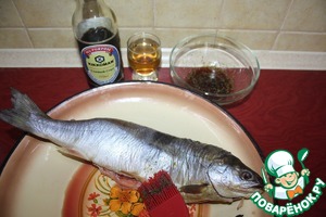 Приготовить маринад: соевый соус, вино, растительное масло, чабер, перец. С помощью кисточки намазать рыбку внутри и снаружи. Оставить для маринования.
