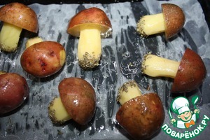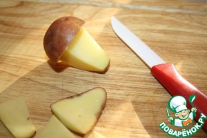 Тем временем подготовим картофель. Картофель вымыть очень тщательно. Сделать круговой надрез немного выше центра картофелины, не задевая ее середину. Сформировать ножку: сделать срезы с четырех сторон, не задевая шапочку "гриба".