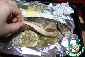 Достать противень, выложить на него фольгу с рыбой. В брюшко рыбы поместить кольца лука и лимона, добавить розмарин. Сверху полить рыбку остатками маринада. Продолжать запекать еще мин 20 (для рыбы большего размера нужно более продолжительное время, в таком случае, картофель с рыбой можно ставить запекать одновременно). Можно подавать!