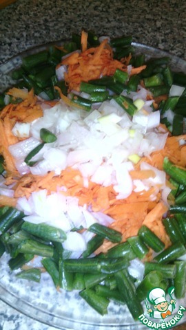 • Затем порезать лук, нашинковать морковь (можно ещё порезать стручковую фасоль, на ваше усмотрение).