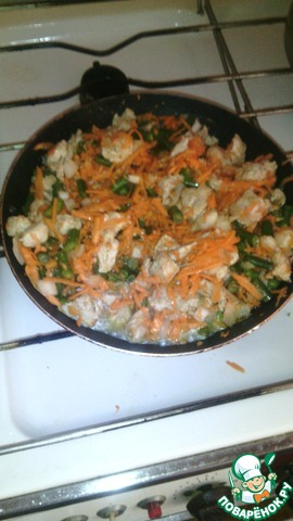 • Добавить готовые овощи и куриное филе, всё тщательно перемешать и обжарить ещё около 5-8 минут. По желанию можно добавить соевый соус.