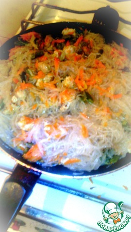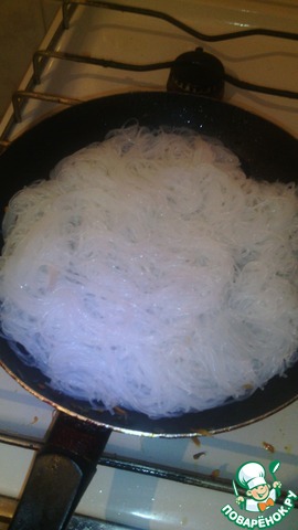 • Вермишель Фунчоза замочить на 3-5 минут в горячей воде, промыть вермишель холодной водой. Затем обжарить на растительном масле 4-5 минут, постоянно помешивая. Добавить весь оставшийся соус и продолжать обжаривать около 3 минут.