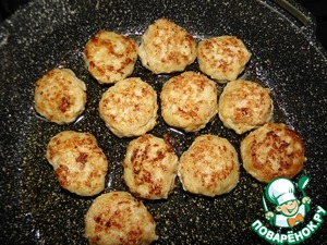 На сковороде разогреть сливочное масло (масла должно быть достаточно), слепить, или скатать мокрыми руками маленькие котлетки ( размер как у фрикаделек приблизительно). и быстро обжарить до зарумянивания. Переложить в форму, или сковороду для тушения