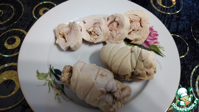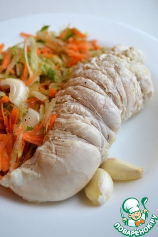 [+5]Грудки связывала обычной толстой нитью. После остывания в кастрюле переложила грудки в контейнер, добавила несколько зубчиков свежего чеснока и поставила в холодильник.