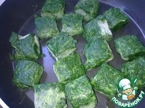 Шпинат прожарьте на сковороде, чтобы испарилась вся жидкость.