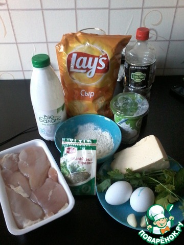 Ингредиенты для «Нежная курочка в сыре и чипсах с легким соусом»:
