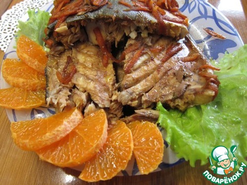 Запеченную рыбку вынимаем из духовки, убираем фаршировку из брюшка и лук с имбирем со спинки. Выкладываем рыбку на блюдо.