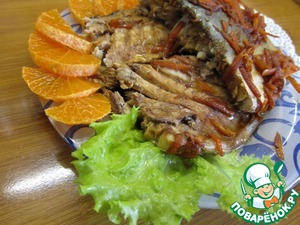 Натираем слегка солью, перцем, вином, фаршируем веточками сельдерея, тонко нарезанными пластинками имбиря и нарезанным луком.