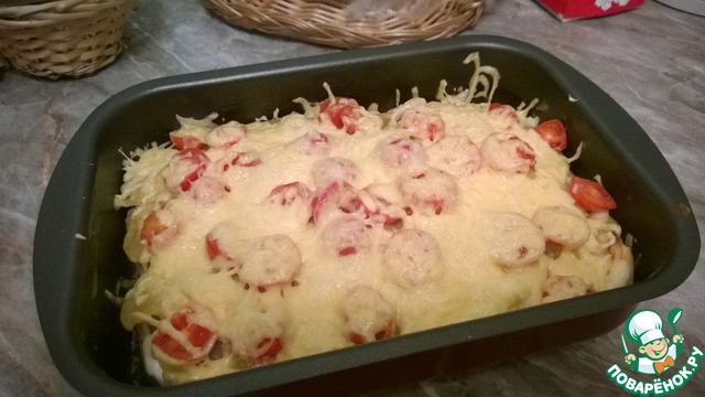 [+5]Майонез не размазывала, поленилась лишнюю ложку мыть))). И хоть сыр накидала ровным слоем, верх запёкся симпатичными волнами.