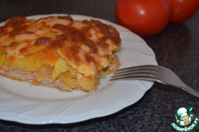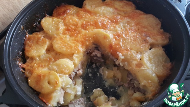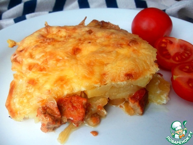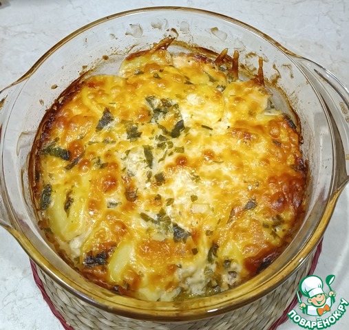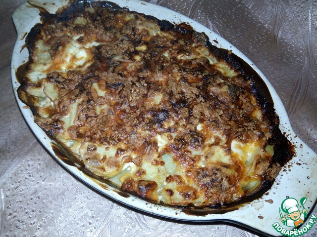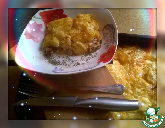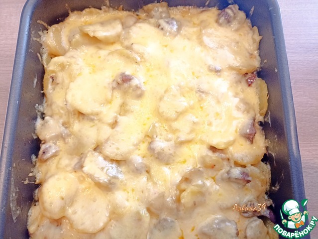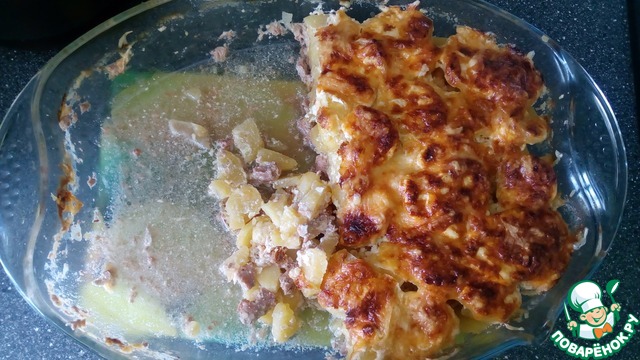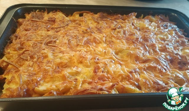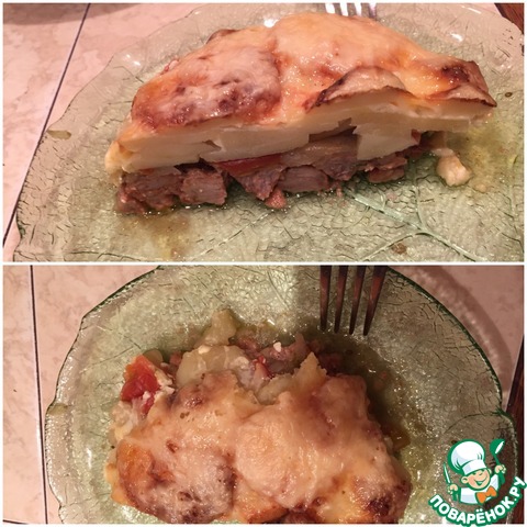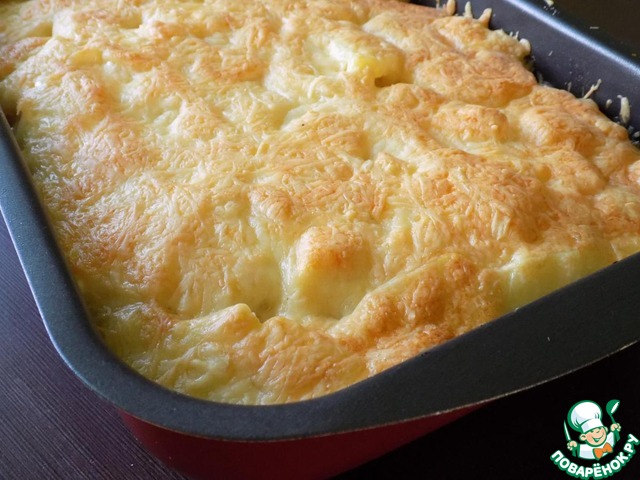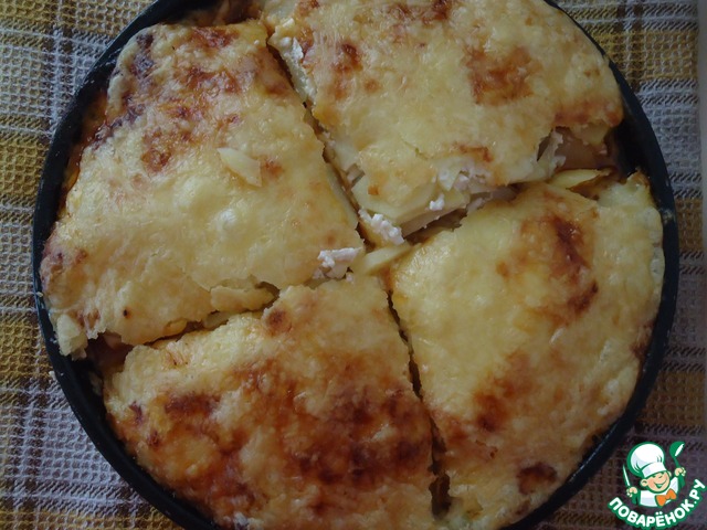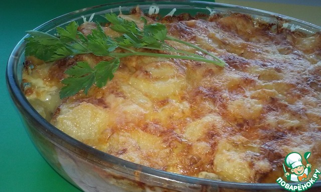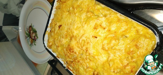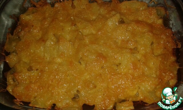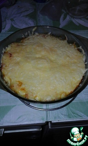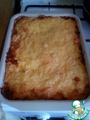 И последний - сыр. Сыр выкладывайте сразу, т. к. он образует корочку, под которой всё запекается в собственном соку. Отправляем в духовку. Если форма металлическая с тонкими стенками то на 50-60 мин при t=200 градусов. Если форма толстая, керамическая, как на фото, то запекаем минут на 20 больше.