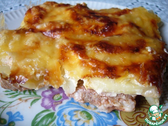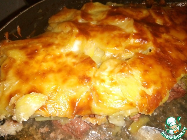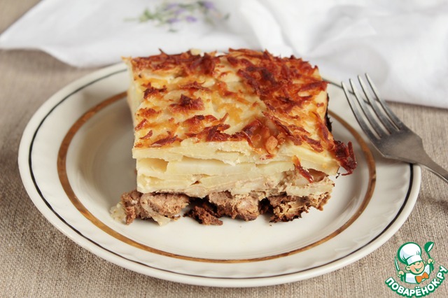 По истечении времени, форму смазываем растительным маслом и начинаем выкладывать слои. Первый - мясо. -