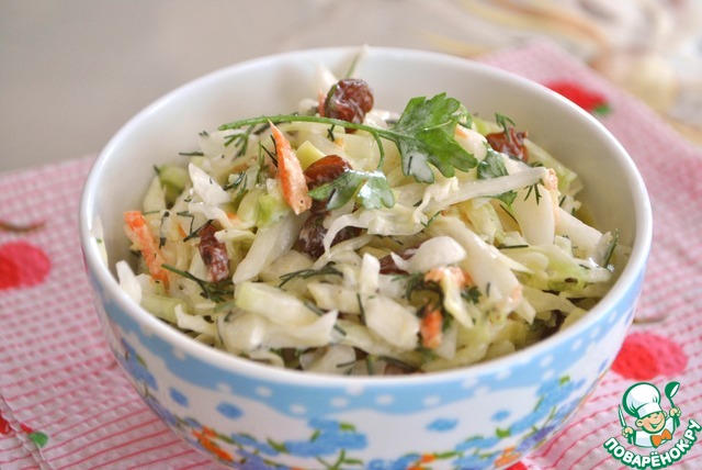 Изюм промываем и заливаем кипятком на 10 мин, затем обсушиваем. Молодую капусту режем тонкой соломкой. Зелень рубим.