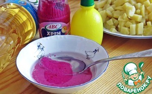 Далее смешиваем все ингредиенты заправки и взбиваем вилкой или венчиком. Советую ничего не игнорировать. Разве что перец - по желанию. Я не добавляла. У меня здесь хрен со свеклой!
