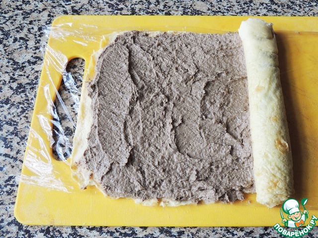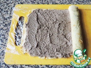 Омлет перевернуть на пленку и снять пергамент. Сверху намазать готовый паштет и свернуть в плотный рулет. Упаковать в пленку и выдержать в холодильнике не меньше часа.