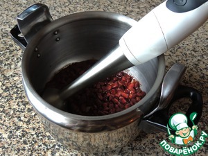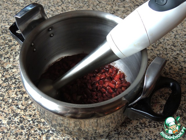Готовую фасоль пюрировать с помощью блендера вместе с оставшейся при варке жидкостью. Получается примерно 600 г готового фасолевого пюре. Для паштета понадобится четверть. Неиспользованное сразу пюре можно хранить в морозилке.