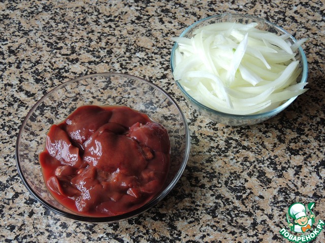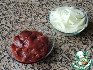 Нарезать лук и печень (можно крупно). На растительном масле обжарить сначала печень, затем добавить лук и потушить все вместе под крышкой 7-10 минут до готовности печени и карамелизации лука.