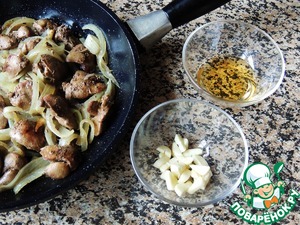 К печени и луку добавить измельченный чеснок и коньяк (по желанию). Обжаривать еще 1-2 минуты.