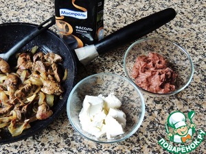 Печень остудить. Добавить готовое фасолевое пюре и творожный сыр.