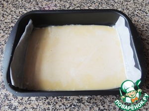 Вылить полученную массу в застеленную пергаментом форму (у меня размер 22х30 см) и запекать в духовке 10 минут до готовности. Омлет поднимется, а при остывании осядет.