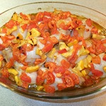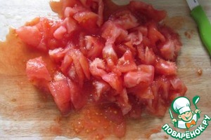 Помидоры обдаем кипятком и снимаем кожицу. Нарезаем кусочками.