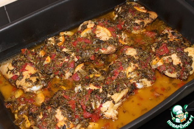 Кинза.....она в этом блюде восхитительна и придаёт особую изюминку курочке.