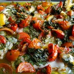 В миске смешиваем кинзу, помидоры, лимон, вливаем лимонный сок и оливковое масло, всыпаем соль и перец.