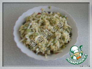 В это время готовим начинку. Зеленый лук нарезаем, солим и добавляем мягкое сливочное масло. Хорошо перемешиваем и добавляем яйца (я натираю на крупной терке), начинка готова.