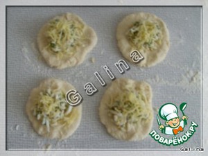 Отрываем по кусочку от теста, формируем лепешку, кладем начинку и немного тертого сыра. Защипываем и выкладываем швом вниз на сковороду и жарим до готовности с обеих сторон.