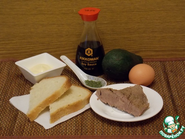 Смешать яйцо, авокадо, мясо, зелень и заправить все майонезом. Положить на хлеб салат и украсить.