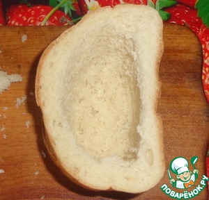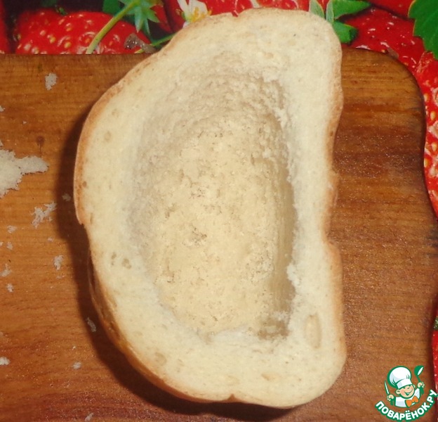 Убираем мякиш с середины каждого кусочка, но не до конца. Смазываем батон внутри сметаной.