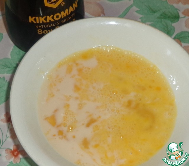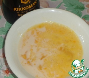 Приготовим заливку. Яйцо разболтать вилкой и смешать с топленым молоком и соевым соусом Kikkoman.