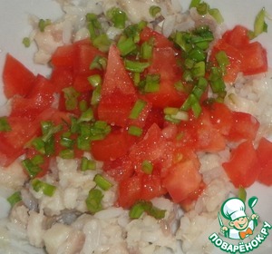 Помидор порезать кубиками. Добавить к основной массе помидор и измельченный зеленый лук. Перемешать, добавить черный молотый перец по вкусу и мускатный орех.
