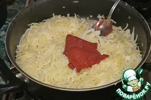 В глубоком сотейнике разогреть 1 ст. л. растительного масла, выложить капусту, помешивая прогреть ее. Добавить томат-пюре, немного бульона и тушить на маленьком огне под крышкой 30–40 минут, до мягкости.