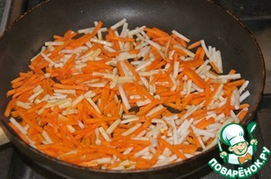 Тем временем спассеровать лук, морковь и сельдерей до мягкости.