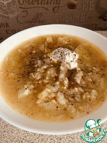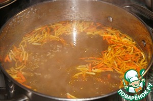 В кипящий бульон или воду всыпать крупу, довести до кипения и варить при слабом кипении 20 минут. Немного посолить. Добавить зажарку.