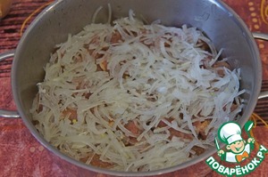 Мясо уложить на дно глубокой сковороды (или в порционные формы). Сверху равномерно разложить половину лука