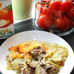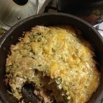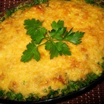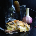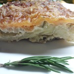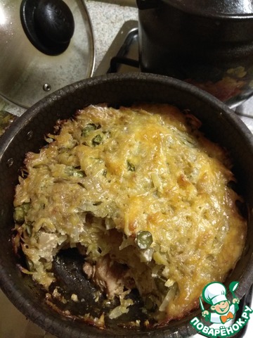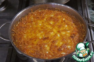 Поставить сковороду в духовку и запекать 40 минут при 220*С, чтобы схватился сыр, затем температуру снизить до 170*С и запекать еще 40 минут. Если сыр уже достаточно зарумянился, накрыть сковороду фольгой и продолжить запекание до готовности картофеля. Сырой картофель запекается до готовности очень долго, у меня блюдо запекалось в общей сложности 1,5 часа, но все равно картофель был чуть-чуть "аль-дэнте". Чтобы ускорить процесс, можно предварительно отварить картофель до полуготовности.