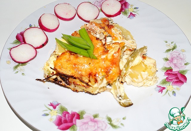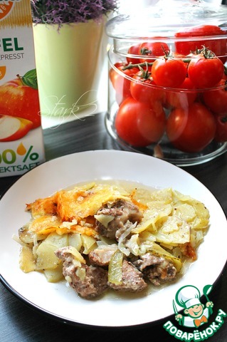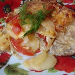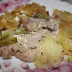 [+5]Картошку резала овощечисткой,слайсами, и потом укладывала в художественном безпорядке,жменьками,равномерно распределяя их по-поверхности. Всё отлично пропеклось.