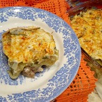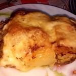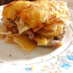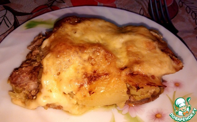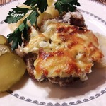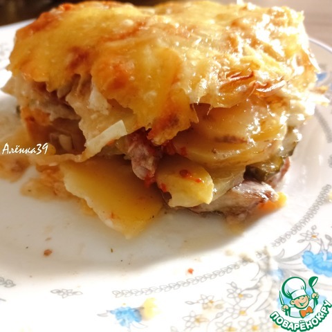 При подаче снять сырную корочку, на тарелку выложить порцию картофельного слоя, рядом мясо и кусочек сырной корочки.